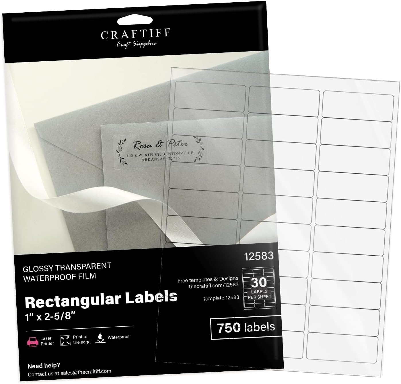 Clear Address Labels 1 x 2 5/8 inch Stickers Paper Glossy Transparent for Laser Printers. Pack of 750, Printable Vinyl Blank for Mail and Home Craftiff