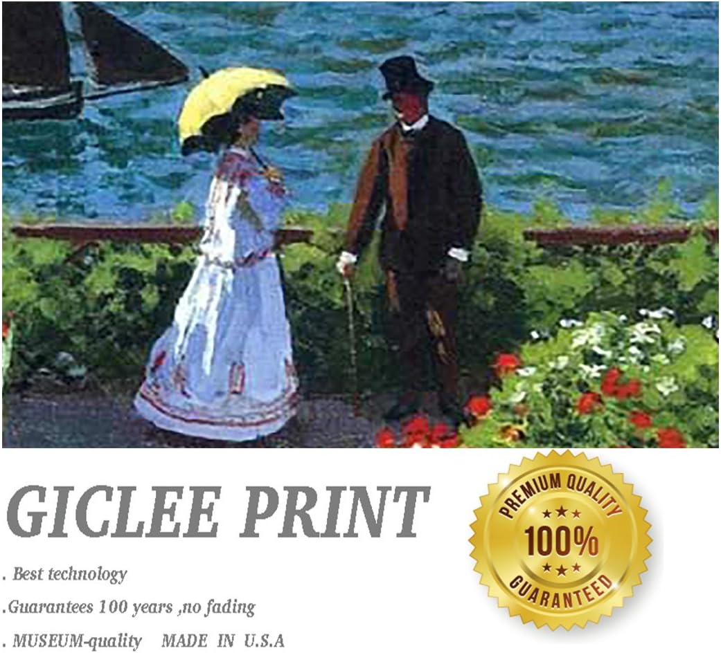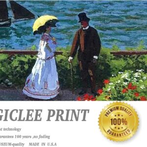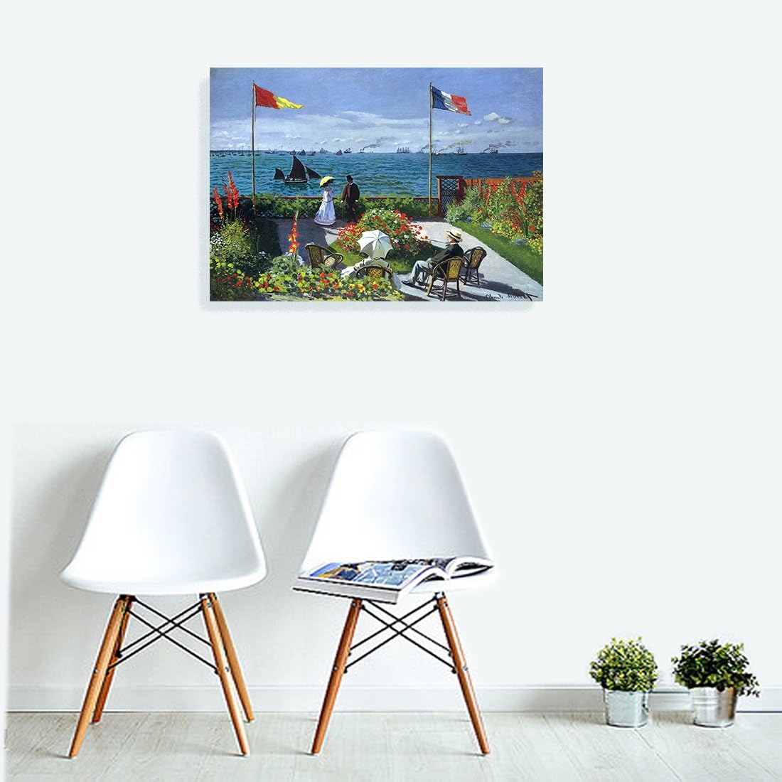 Monet spent the summer of 1867 at the resort town of Sainte-Adresse on the English Channel, near Le Havre (France). It was there, in a garden with a view of Honfleur on the horizon, that he painted this picture, which combines smooth, traditionally rendered areas with sparkling passages of rapid, separate brushwork, and spots of pure colour. It was there that he painted this buoyant, sunlit scene of contemporary leisure, enlisting his father (shown seated in a panama hat) and other relatives as models. By adopting an elevated viewpoint and painting the terrace, sea, and sky as three distinct bands of high-keyed color, Monet emphasized the flat surface of the canvas