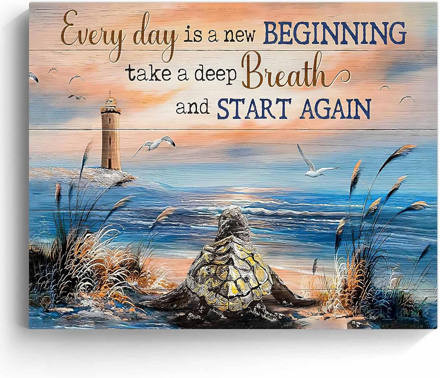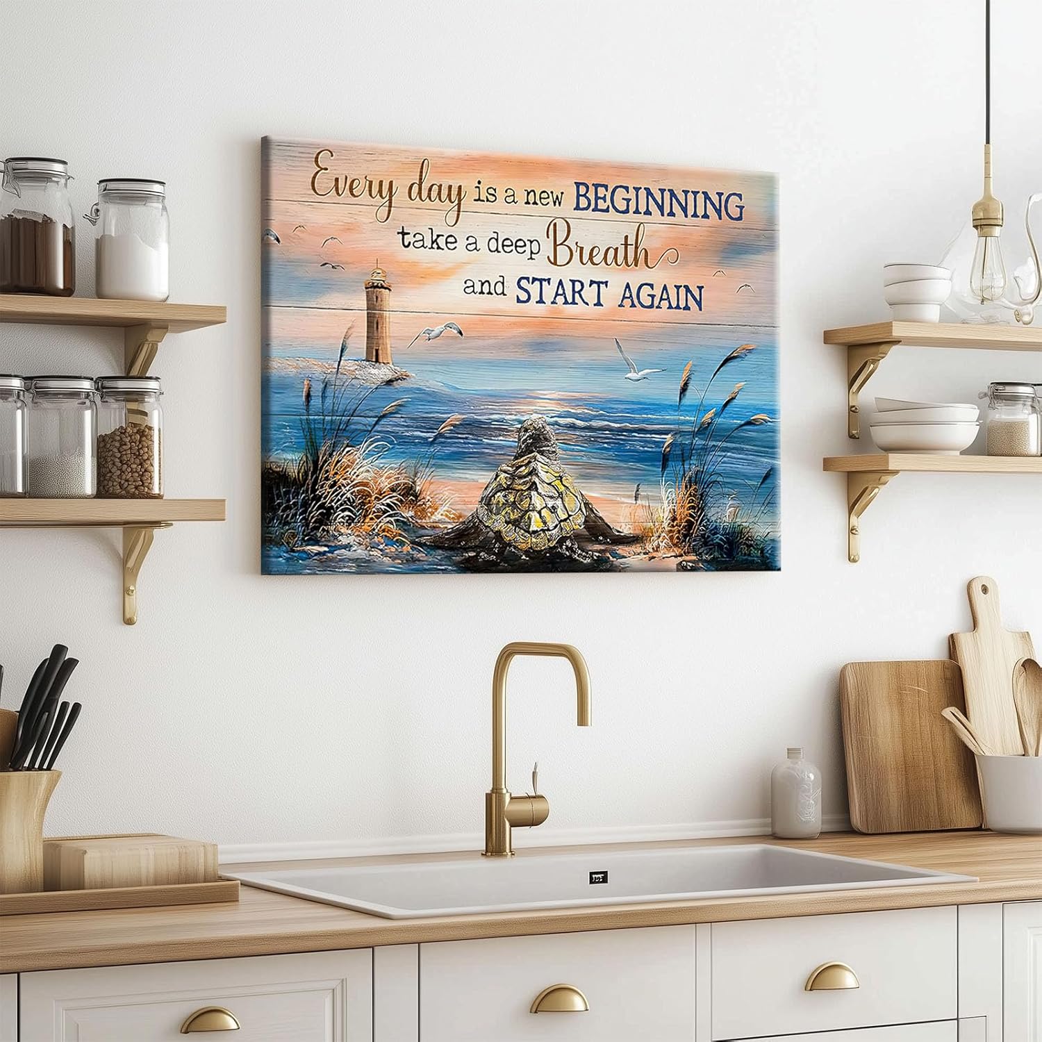 Inspirational Canvas Wall Art, “Every Day is a New Beginning” Motivational Quote Print, Seaside View with Turtle and Lighthouse, Framed Picture Print Wall Art for Living Room and Office 16″ x 20″