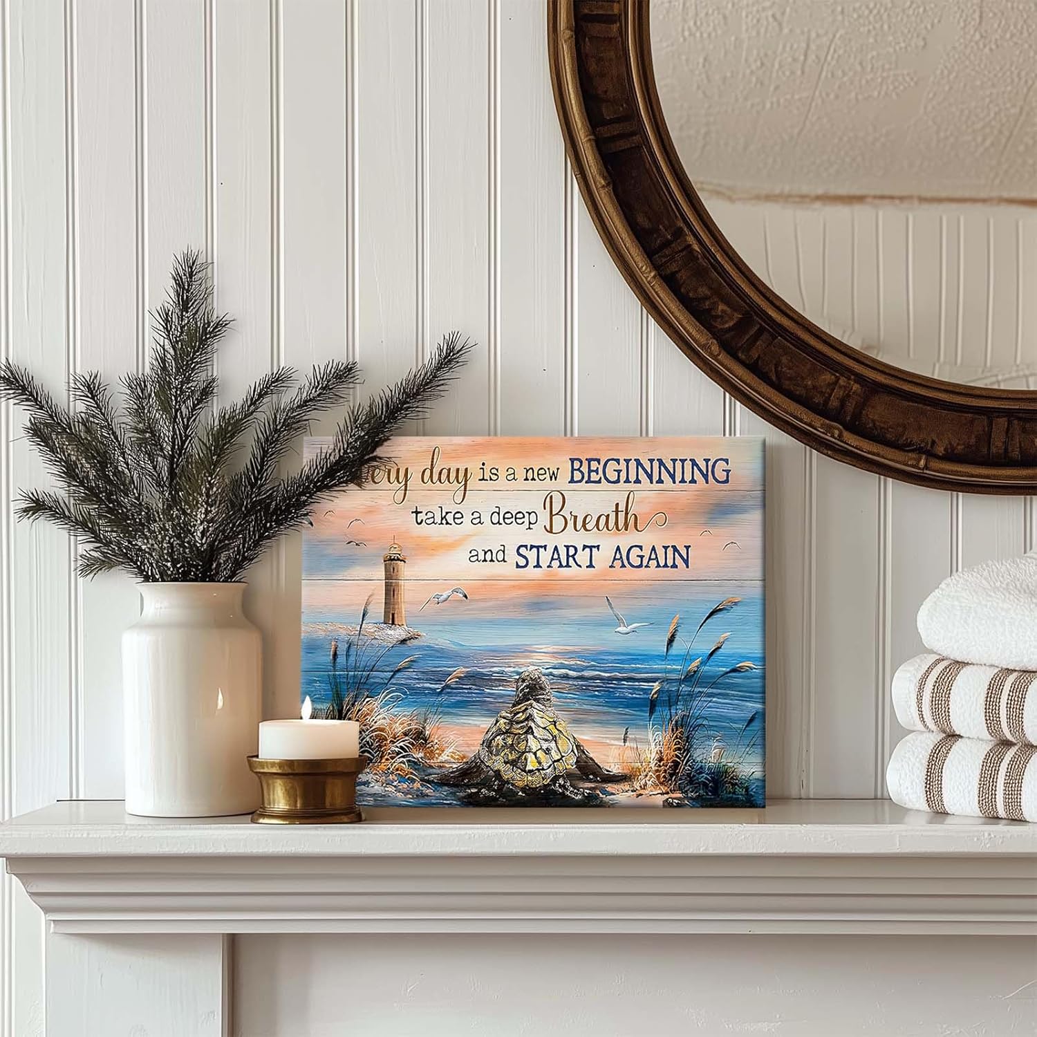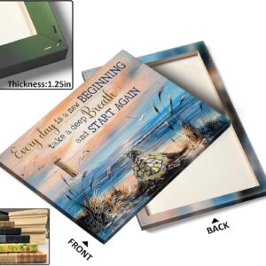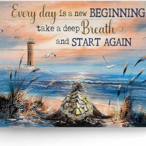 Inspirational Canvas Wall Art, Every Day is a New Beginning Motivational Quote Print, Seaside View with Turtle and Lighthouse, Framed Picture Print Wall Art for Living Room and Office 24″ x 30″