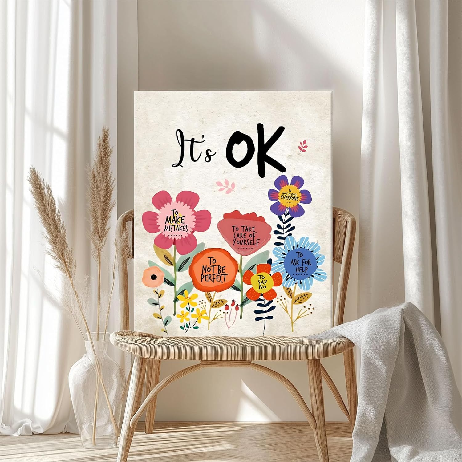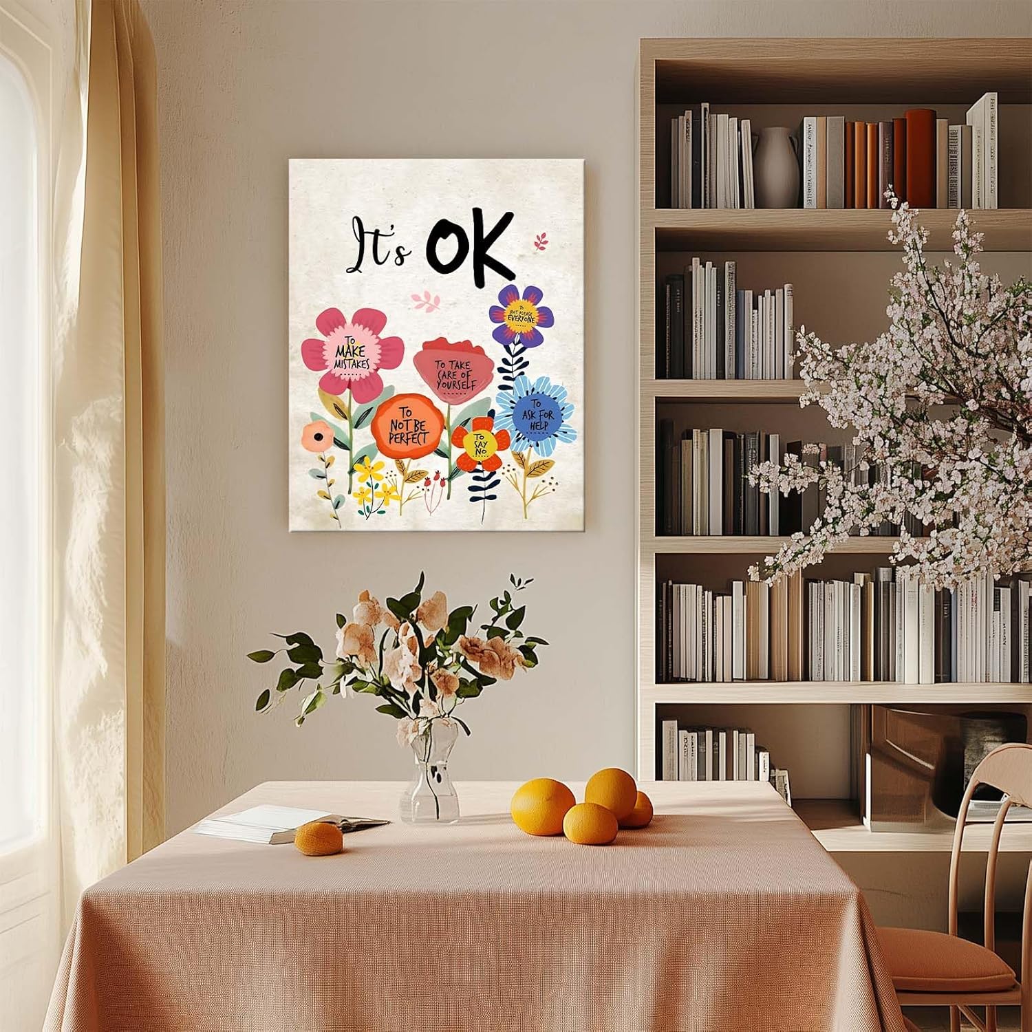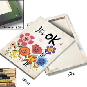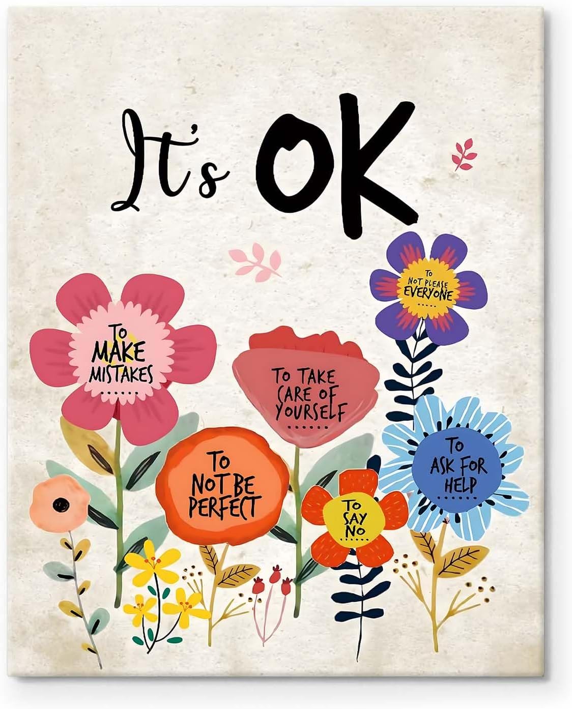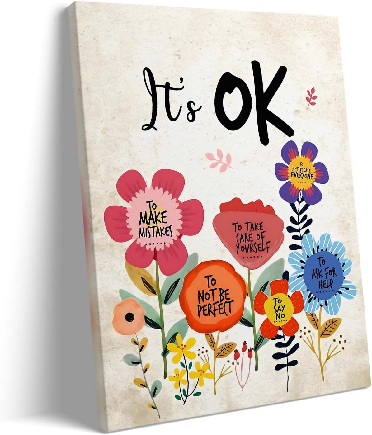 Inspirational Canvas Wall Art, It’s OK to Make Mistakes, Not Be Perfect Pictures Print, Motivational Flower Poster Framed Wall Painting for Home or Office, Self-Care Encouragement Art 16″ x 20″
