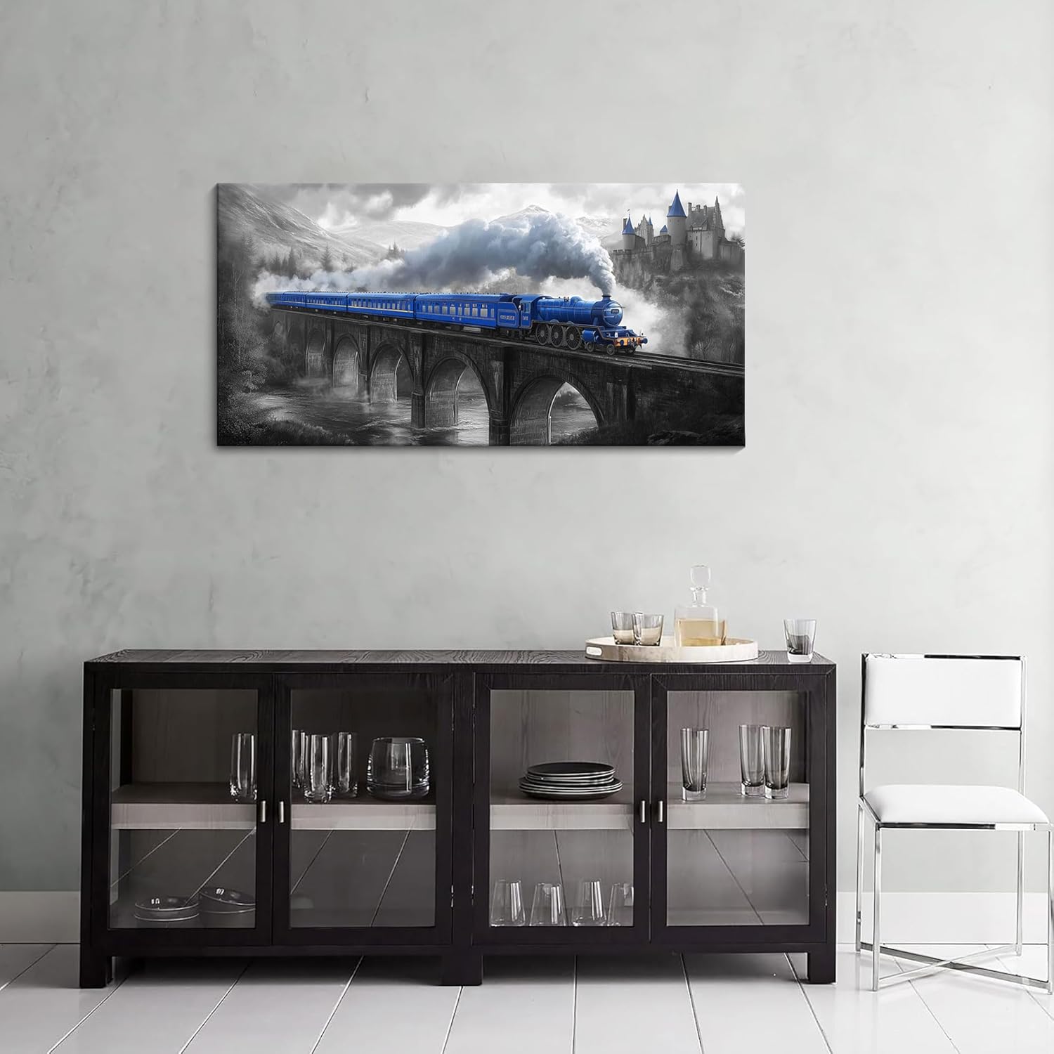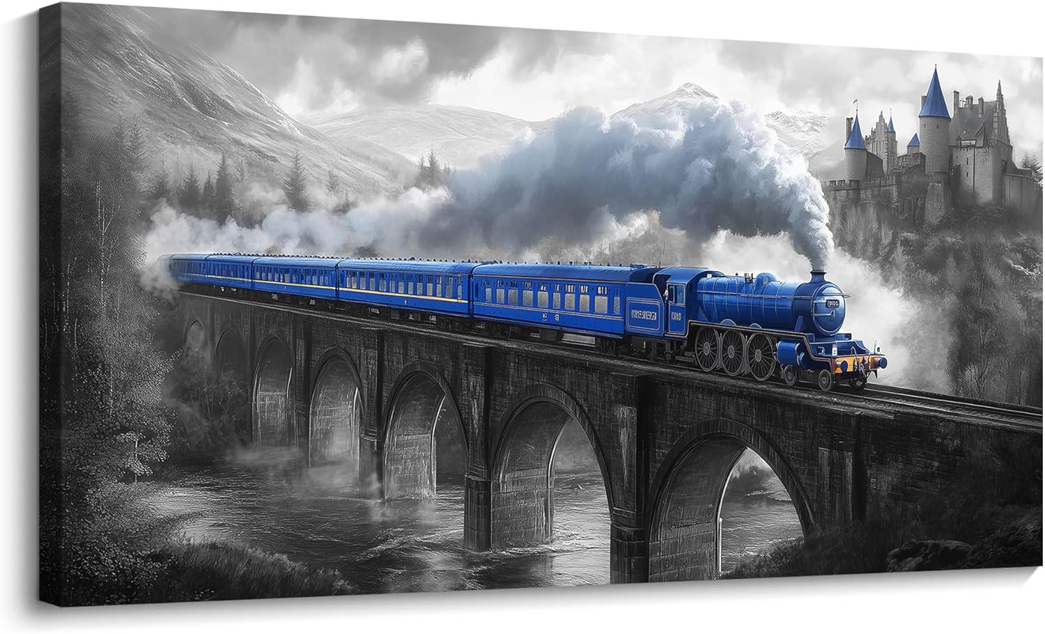 JEAWA Canvas Prints Wall Art – Blue Gray Canvas Painting, Train Artwork Print for Bedroom Bathroom Dining Room Home Office Decor, Great Bridge and Castle Picture, 20 x 40 In