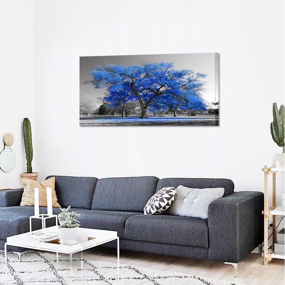 KREATIVE ARTS Canvas Prints Blue Tree Wall Art Painting Contemporary Black and White Fall Landscape Pictures Modern Giclee Stretched and Framed Artwork for Walls 20x40inch