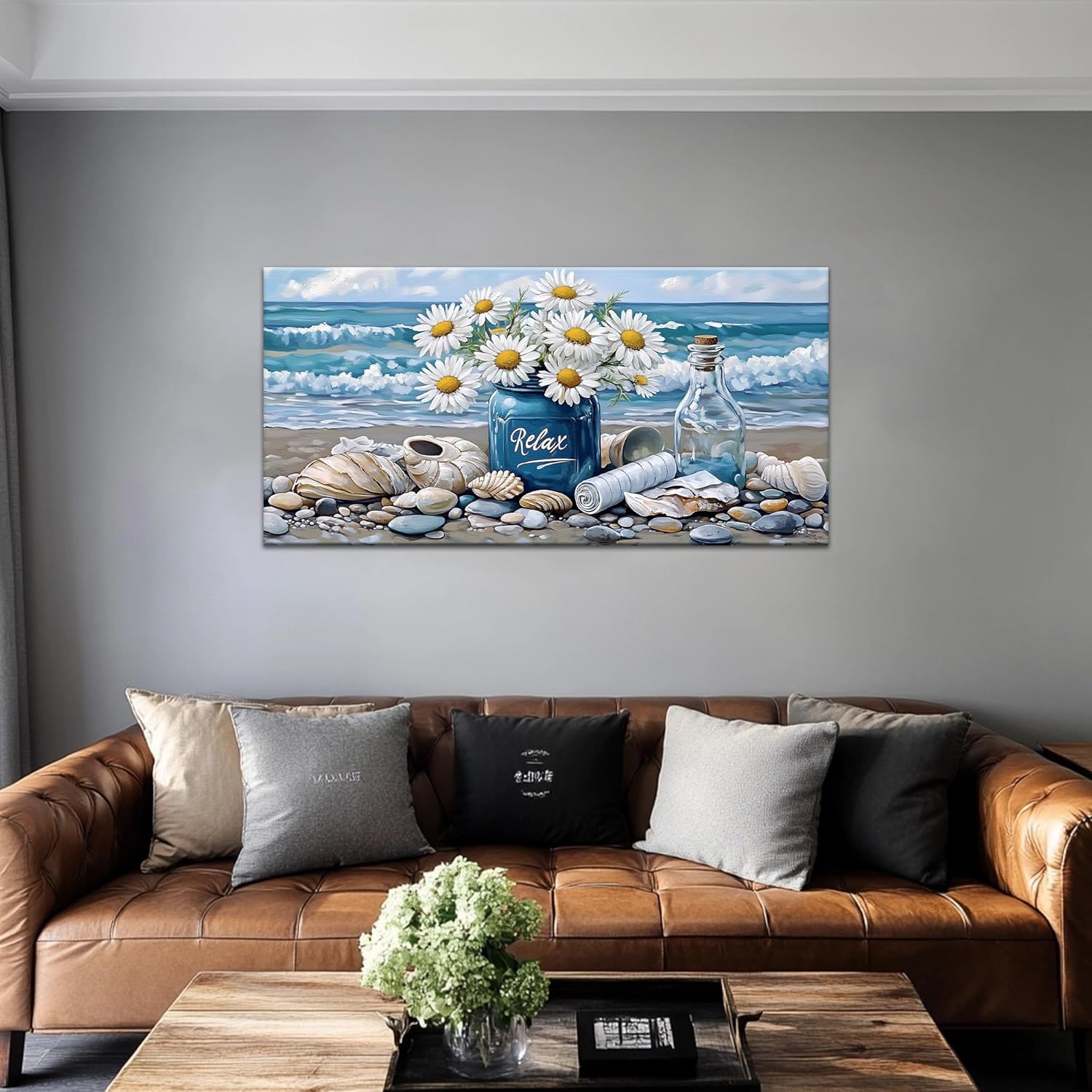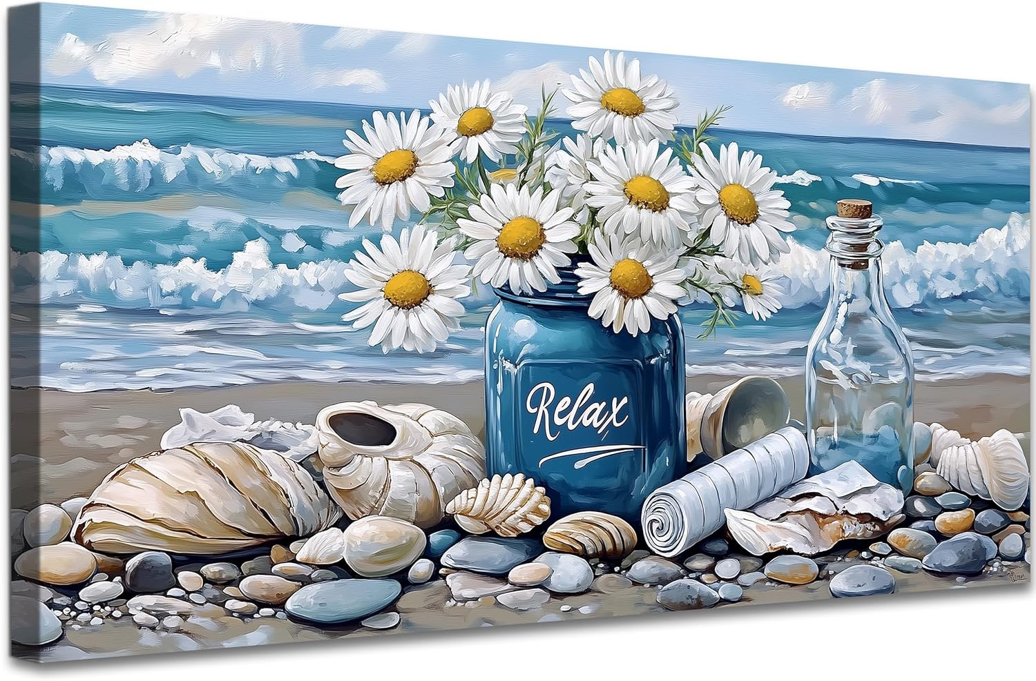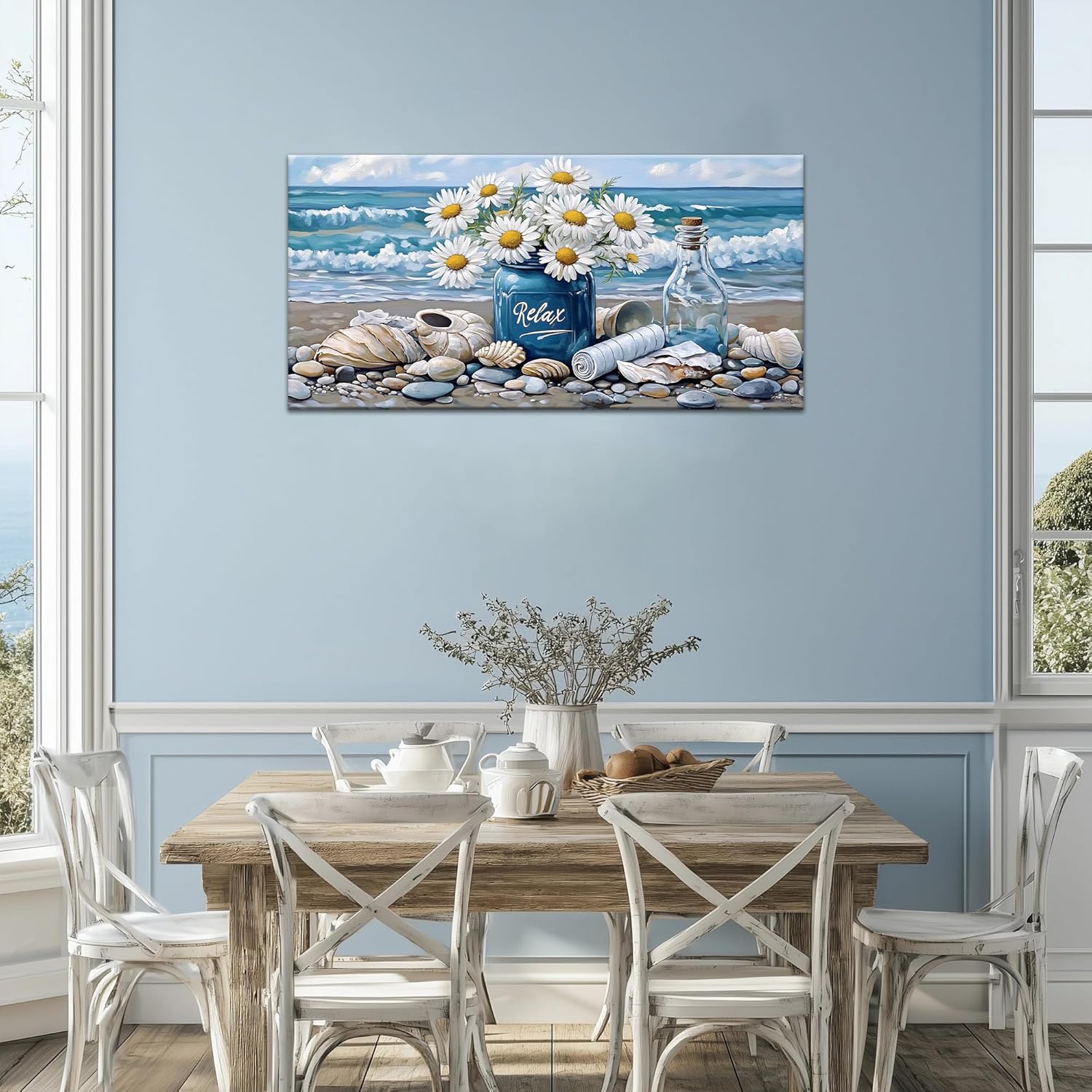 KVTM Bathroom Flower Canva Beach Wall Art, Coastal Wall Decor, Farmhouse Beach Coastal Daisy Floral Ocean Picture Flowers Sea Canvas Print Seascape Artwork for Home Living Room Bedroom 16″x32″