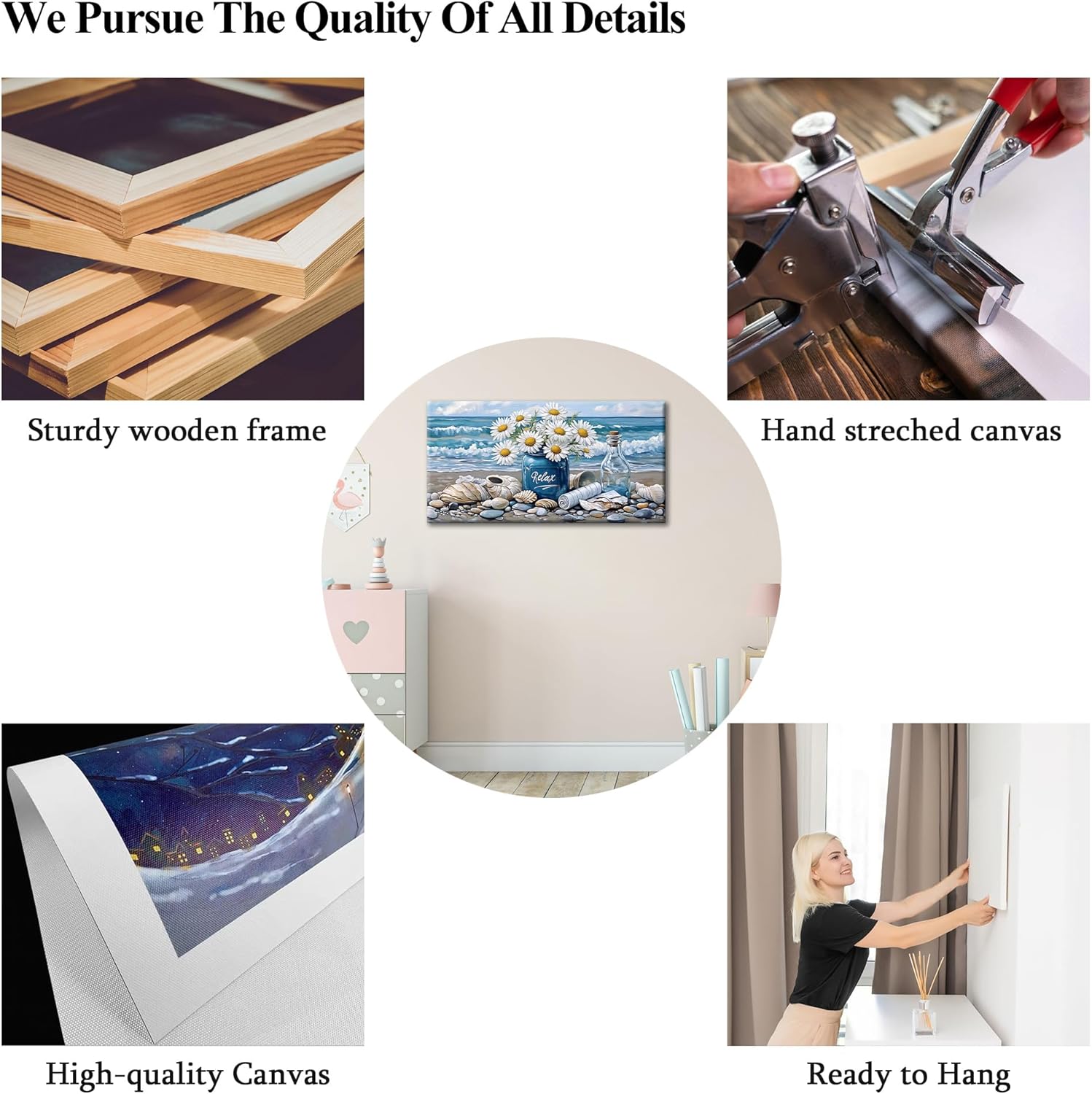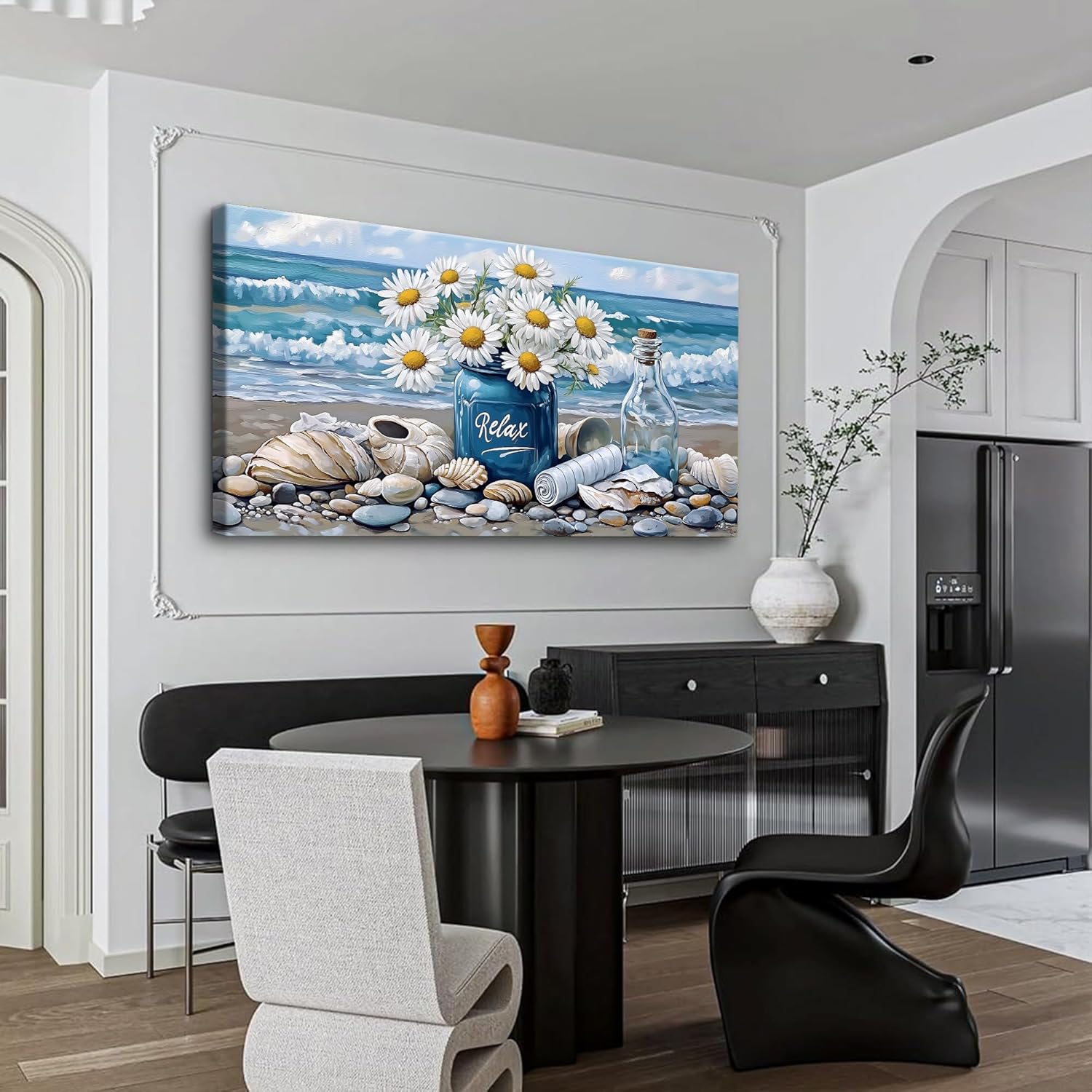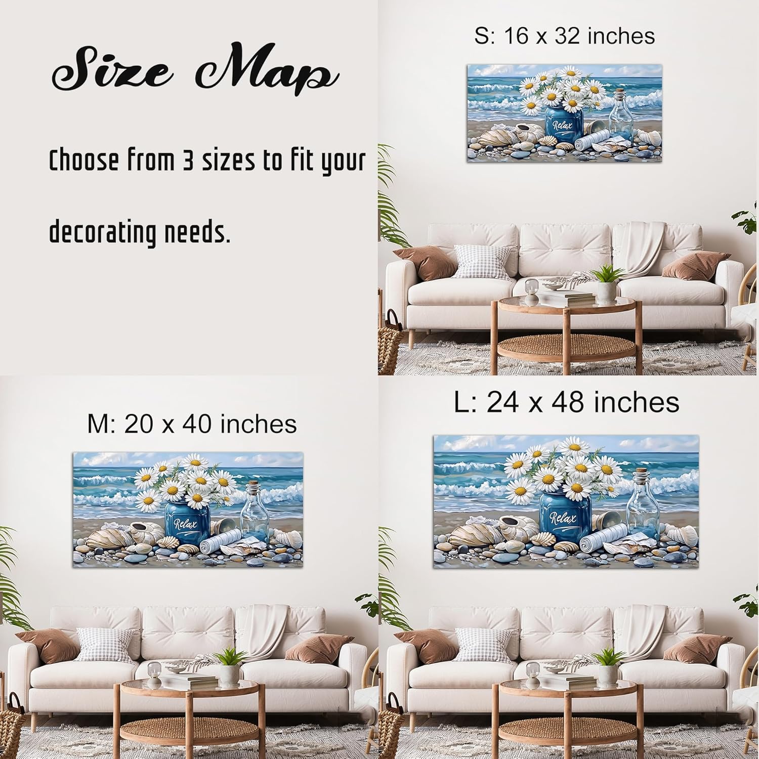 KVTM Bathroom Flower Canva Beach Wall Art, Coastal Wall Decor, Farmhouse Beach Coastal Daisy Floral Ocean Picture Flowers Sea Canvas Print Seascape Artwork for Home Living Room Bedroom 16″x32″