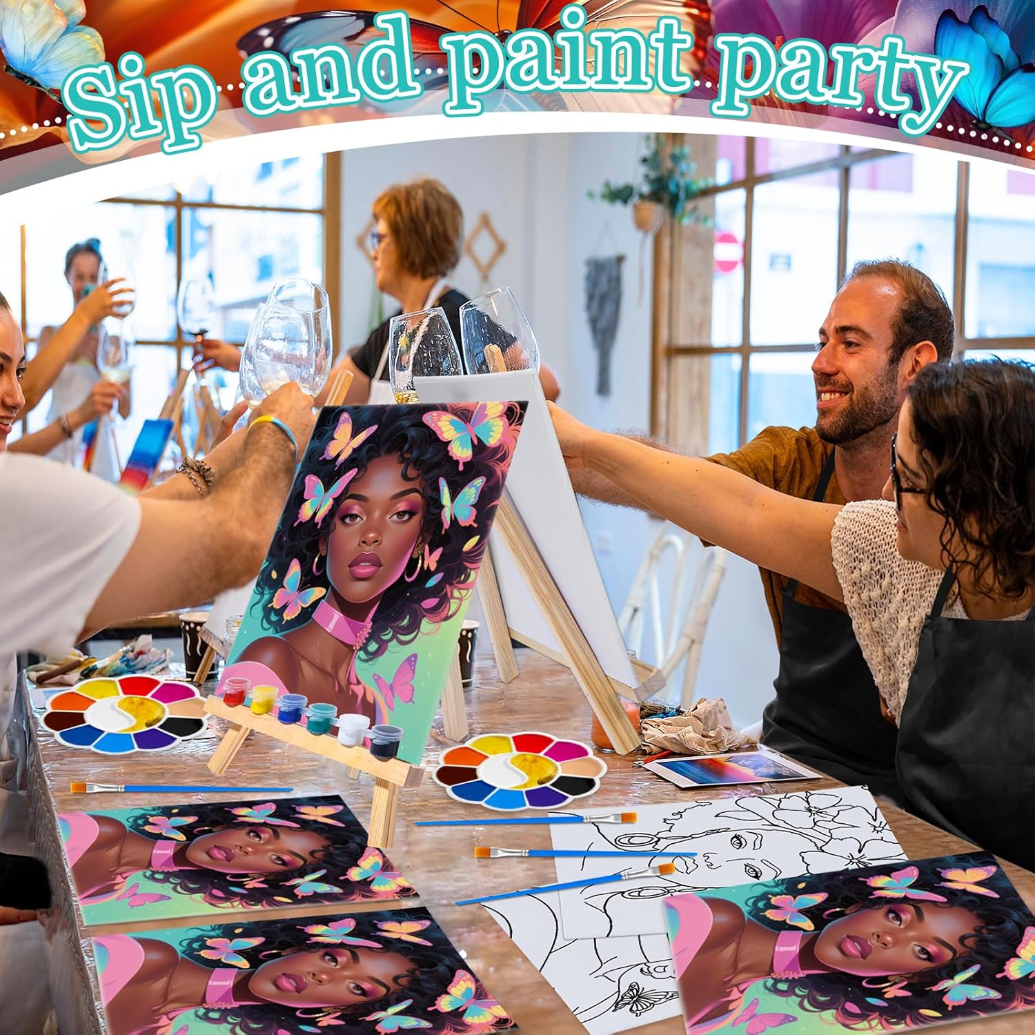 - Package Includes: the sip and paint kit including 6 pieces of butterfly girl canvas paintings about 7.87 x 9.84 inches/ 20 x 25 cm, 6 pieces of apron about 29.53 x 25.2 inches/ 75 x 64 cm, 6 sets of painting tool set, enough to meet your various need; Please note the size information before ordering