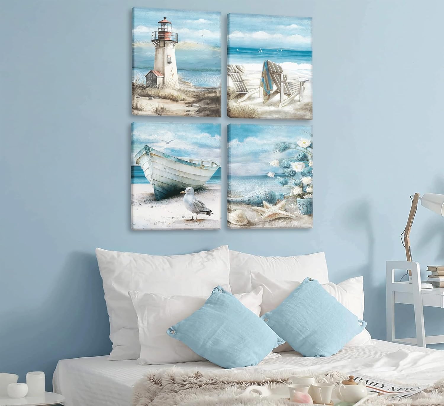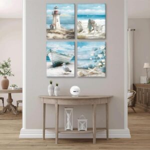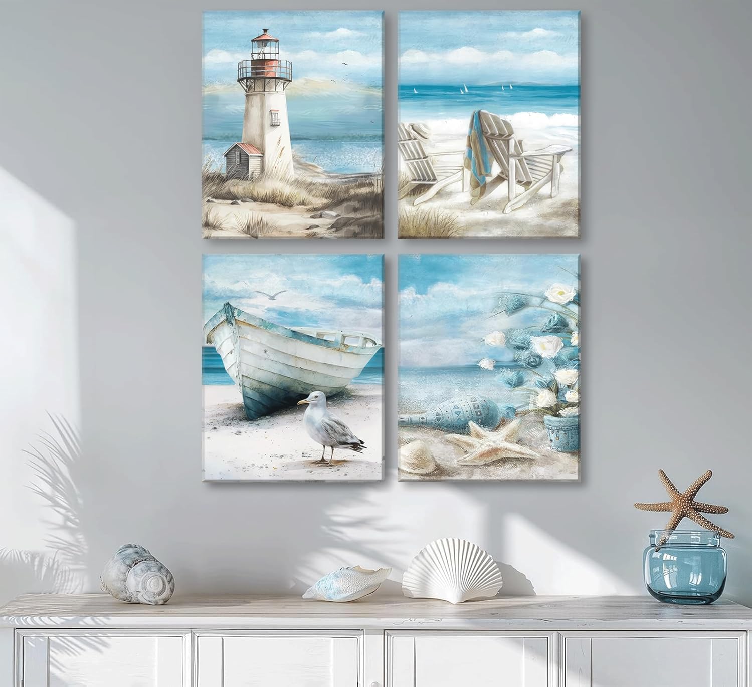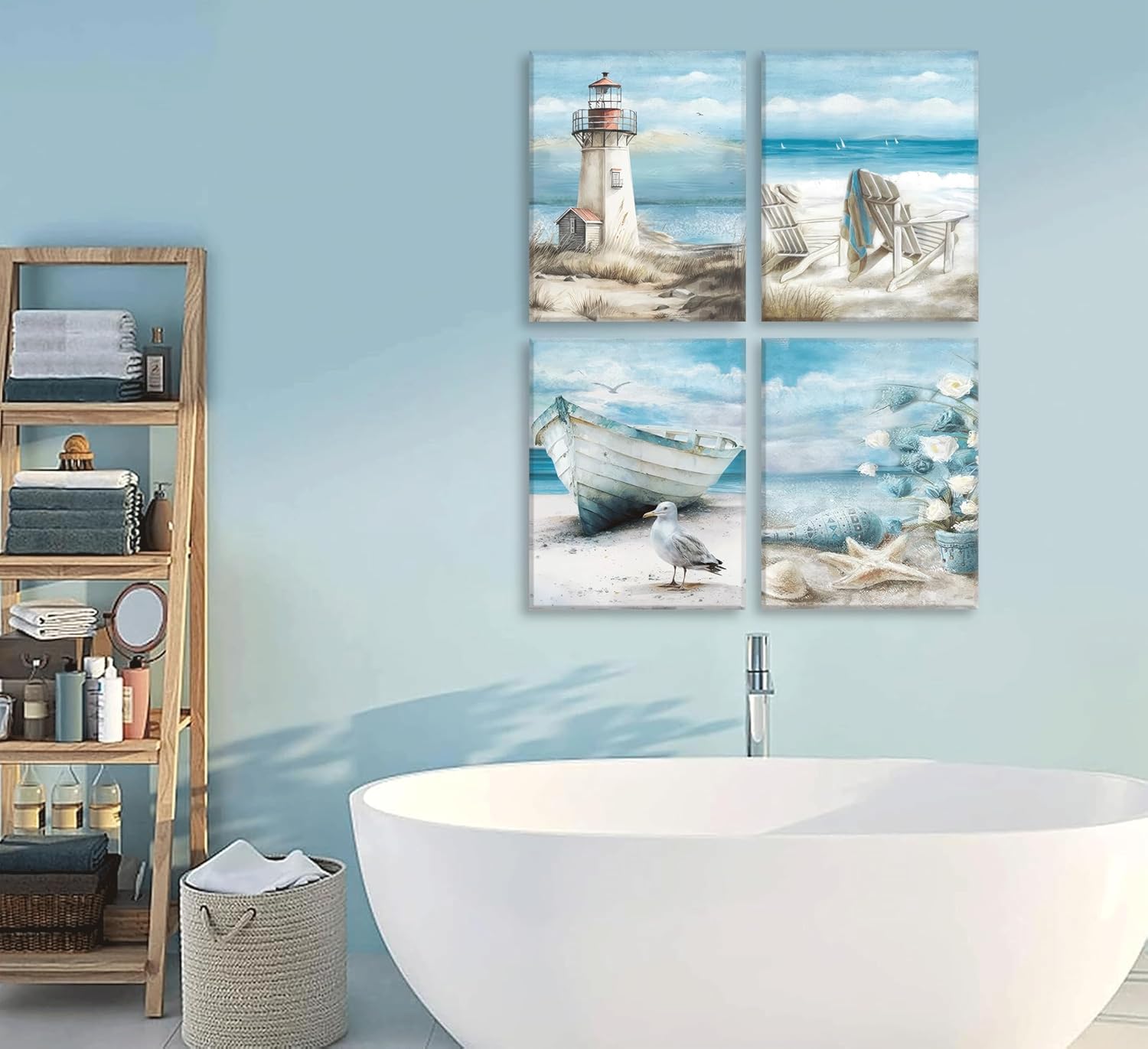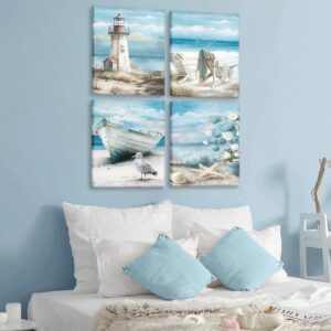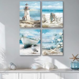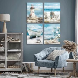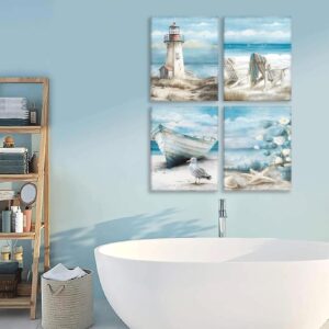 XXOUYLQ 4pcs Blue Beach Canva Wall Art Beach Bathroom Wall Decor Seagull Posters Ocean Flower Pictures lighthouse Painting Starfish Prints Modern Coastal Seascape Canvas frame