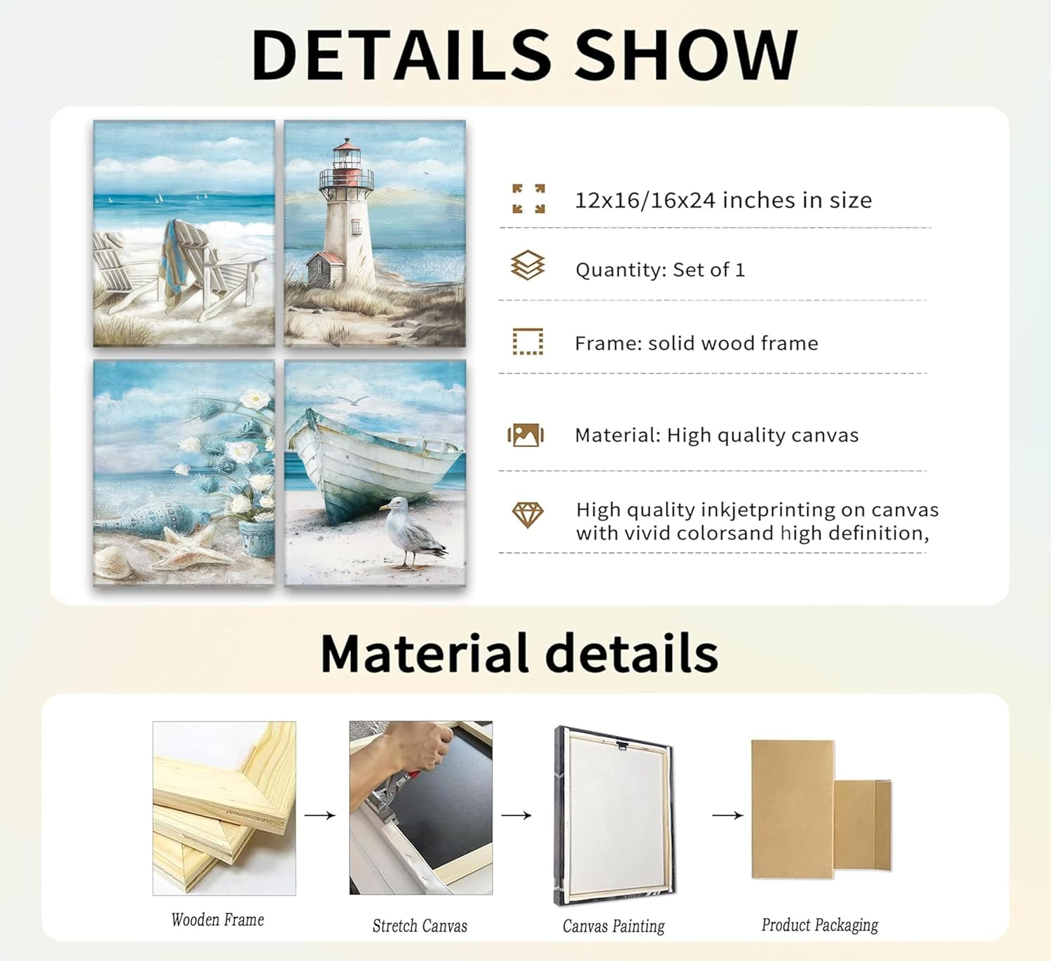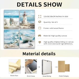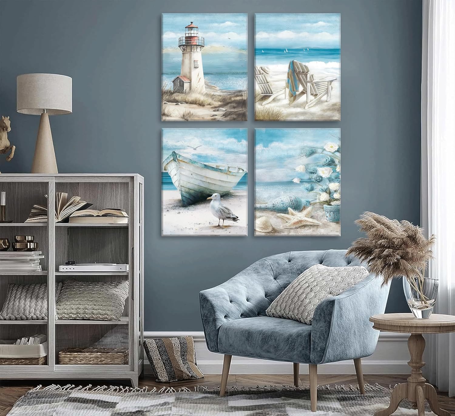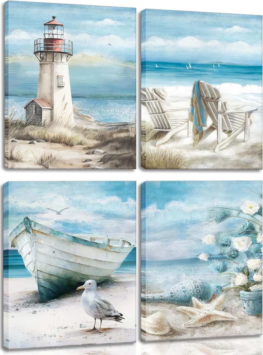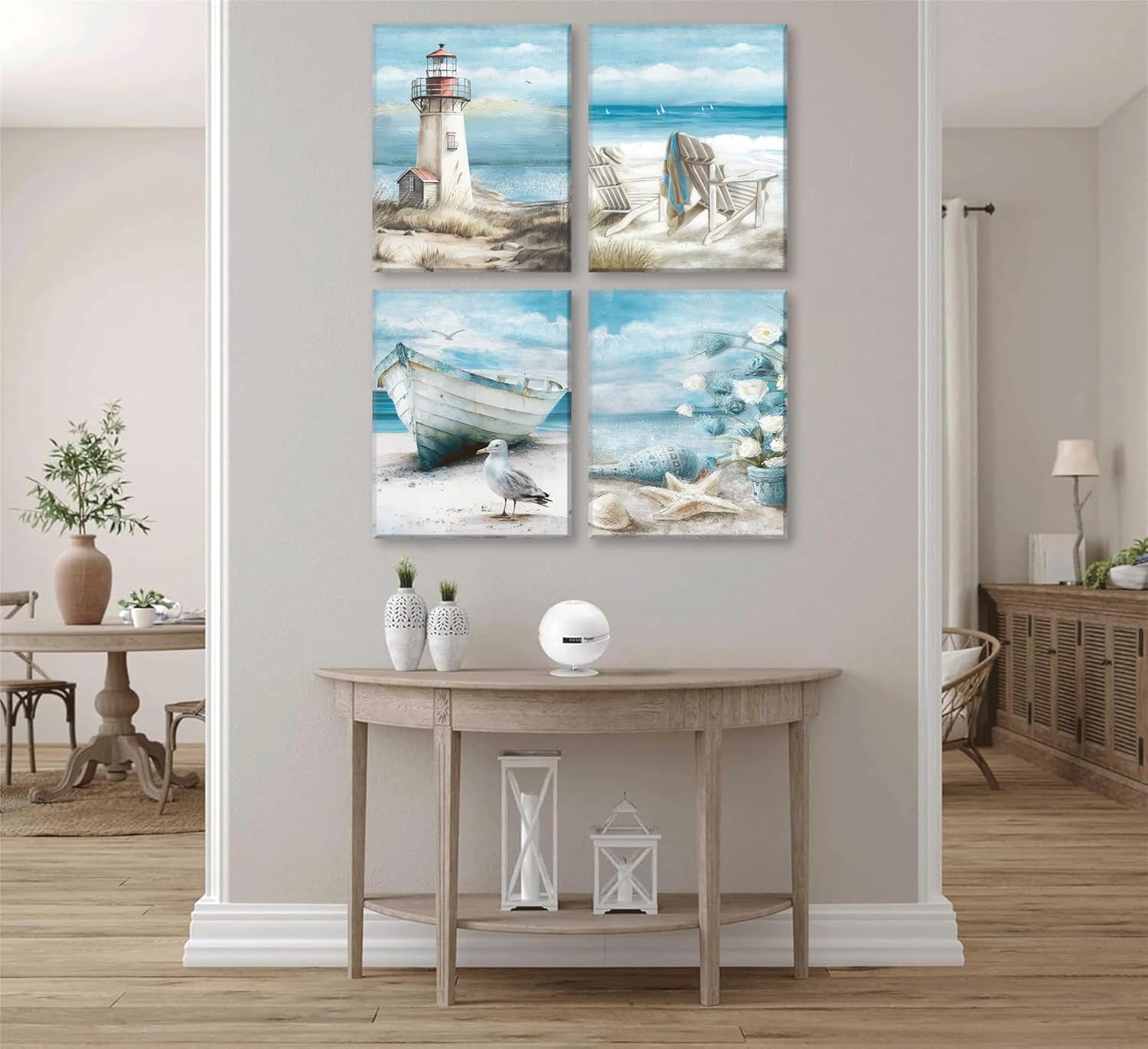 XXOUYLQ 4pcs Blue Beach Canva Wall Art Beach Bathroom Wall Decor Seagull Posters Ocean Flower Pictures lighthouse Painting Starfish Prints Modern Coastal Seascape Canvas frame